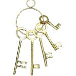 This set of large keys is cast from solid brass, a material favored for its durability and resistance to corrosion. Each key is carefully shaped to fit the wards of heavy iron locks commonly found on strongboxes and gates. The keys hang from a substantial brass ring, forged to hold them securely while allowing easy handling. Brass was often chosen for such keys not only for its sturdiness but also for the distinctive golden sheen that signified authority and importance.