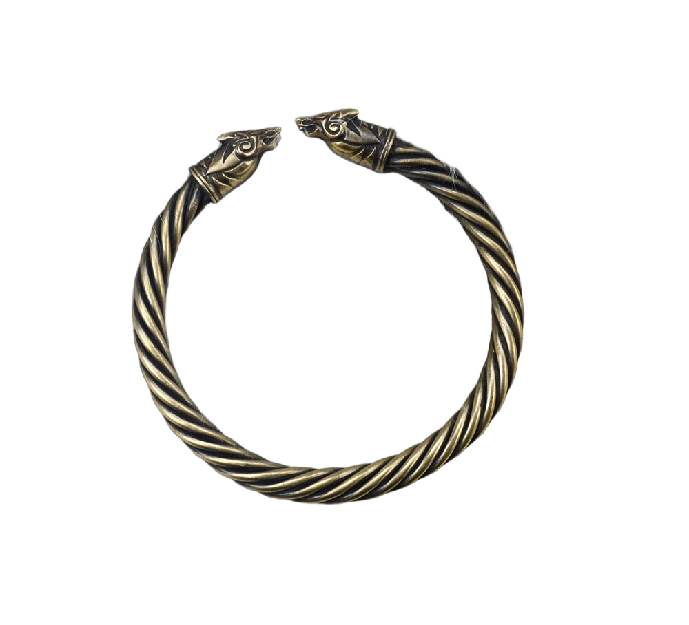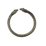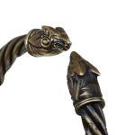 This Lion-Headed bracelet is a wrist torc that can be bent to fit the wrist or forearm. It is crafted from twisted brass and finished with lion’s heads.
