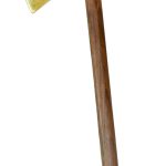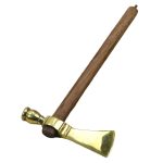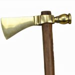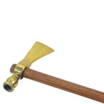 This functional Pipe Tomahawk has a haft of wood and head of brass. The bowl and handle are drilled to allow it to be smoked. A brass mouthpiece completes the axe.
