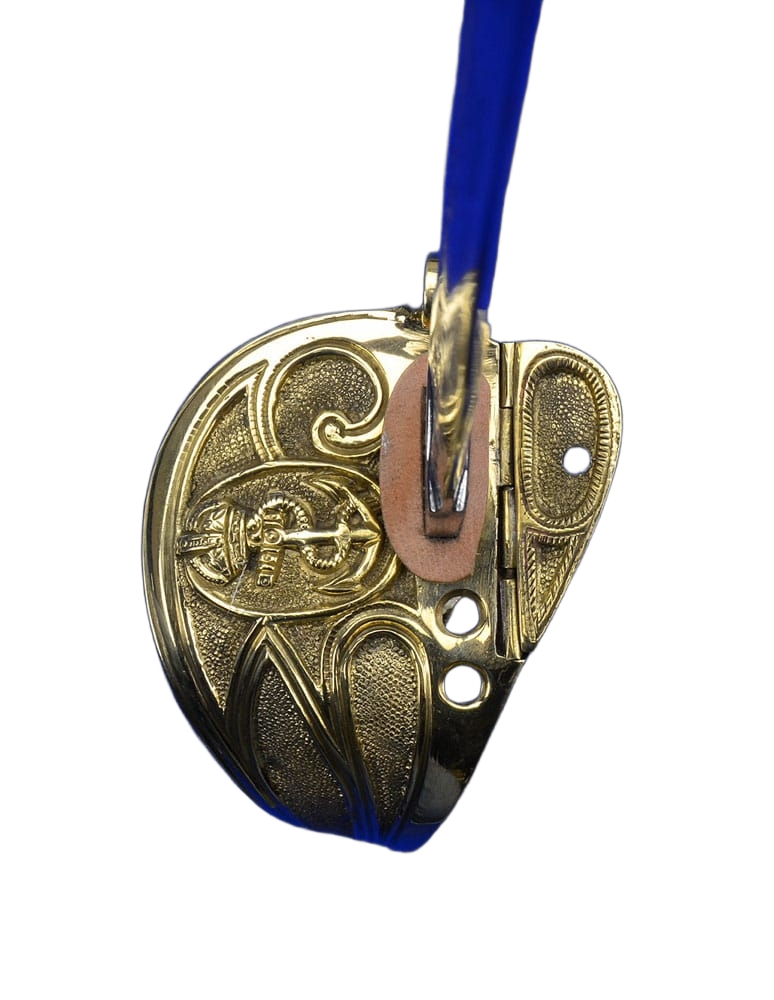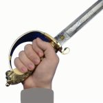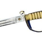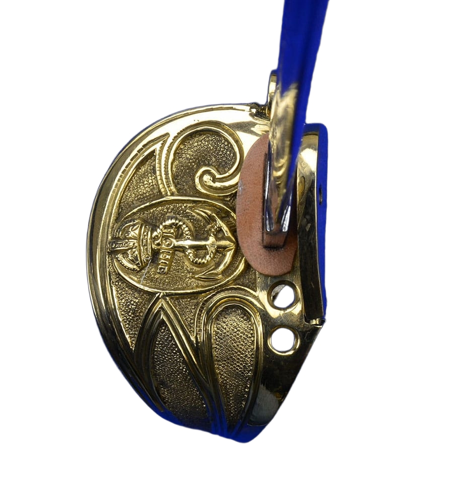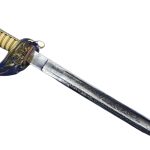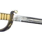 The hilt is brass and features a hinged side panel on the guard which can lock onto the scabbard with a peg – a feature which not only makes the sword more comfortable when worn close to the body, but also secures the sword in its scabbard during a gale at sea. The grip is faux rayskin coupled with bands of fine brass wire.