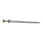 This recreation of a 9th – 10th Century Danish Viking sword has a hilt of finely cast and detailed bronze which is matched with a forged blade of Damascus steel. The blade is vibrantly patterned with ripple and whorl designs created by the folding and melding of the different steels used to create the blade. The hilt is in the form of the Petersen Type D Viking sword typology and is based on a historical example. It is cast in bronze and finished with an antiqued finish to bring out its intricate detailing. Like originals, the pommel is a two-part pommel with the blade tang durably mounted to the pommel base and then concealed with a riveted cap piece.
