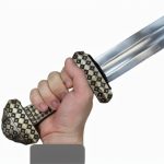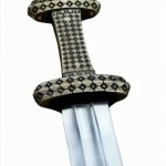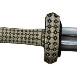 This Type D Viking Sword has a detailed hilt of well-cast bronze and a blade of EN45 high carbon steel. The pommel is of two parts and is finished with a threaded pommel cap over the tang- the two halves of the pommel are then riveted together for strength. A felt tab that protects the guard from contact with the scabbard is fitted atop the guard it can be easily removed if desired.