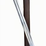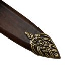 The wood-core scabbard is bound in leather and finished with bronze knotwork accents. It can be worn with its riveted bronze suspension loop.