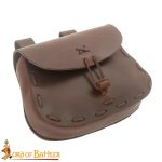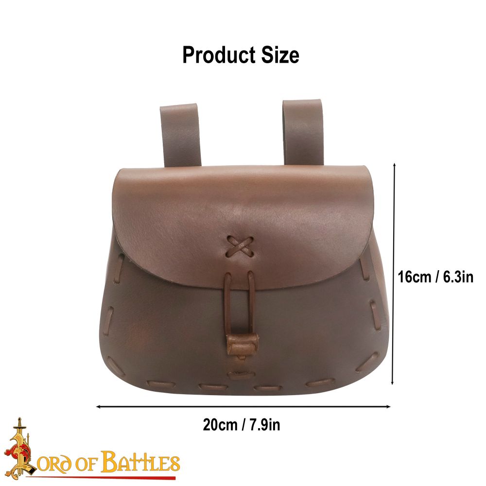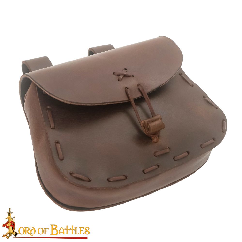 This leather pouch is made entirely from brown leather, held together with thick leather strips. The pouch can be attached to a belt with its integrated belt loops and is securely held close with a leather loop and clasp. A good hip pouch for the coin-clinking merchant or an all-purpose components satchel for the wandering Apothecary.