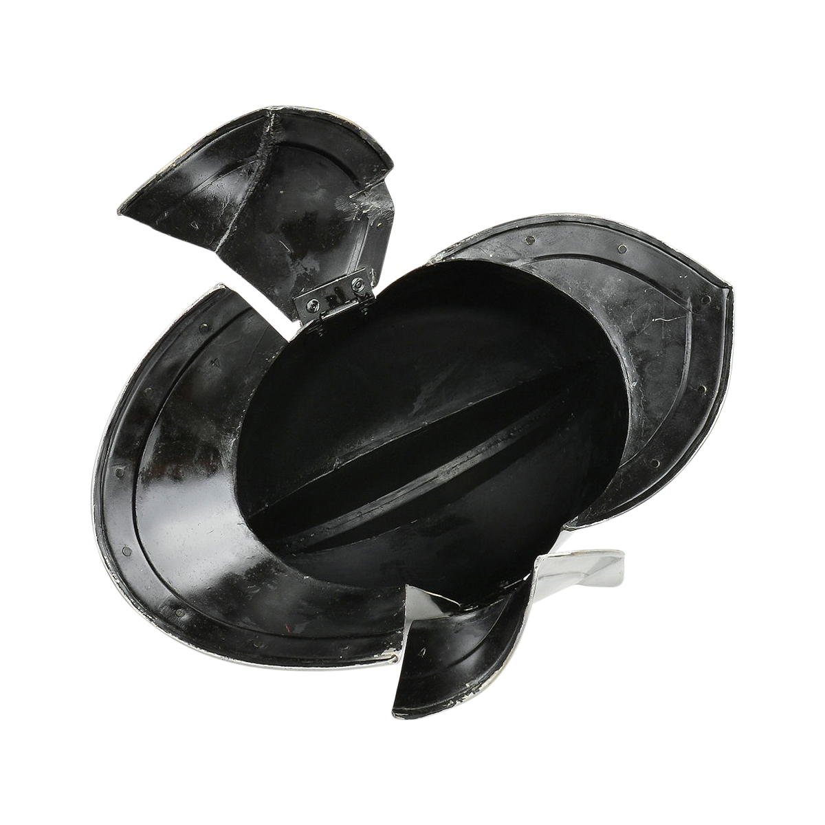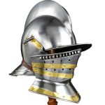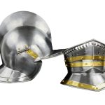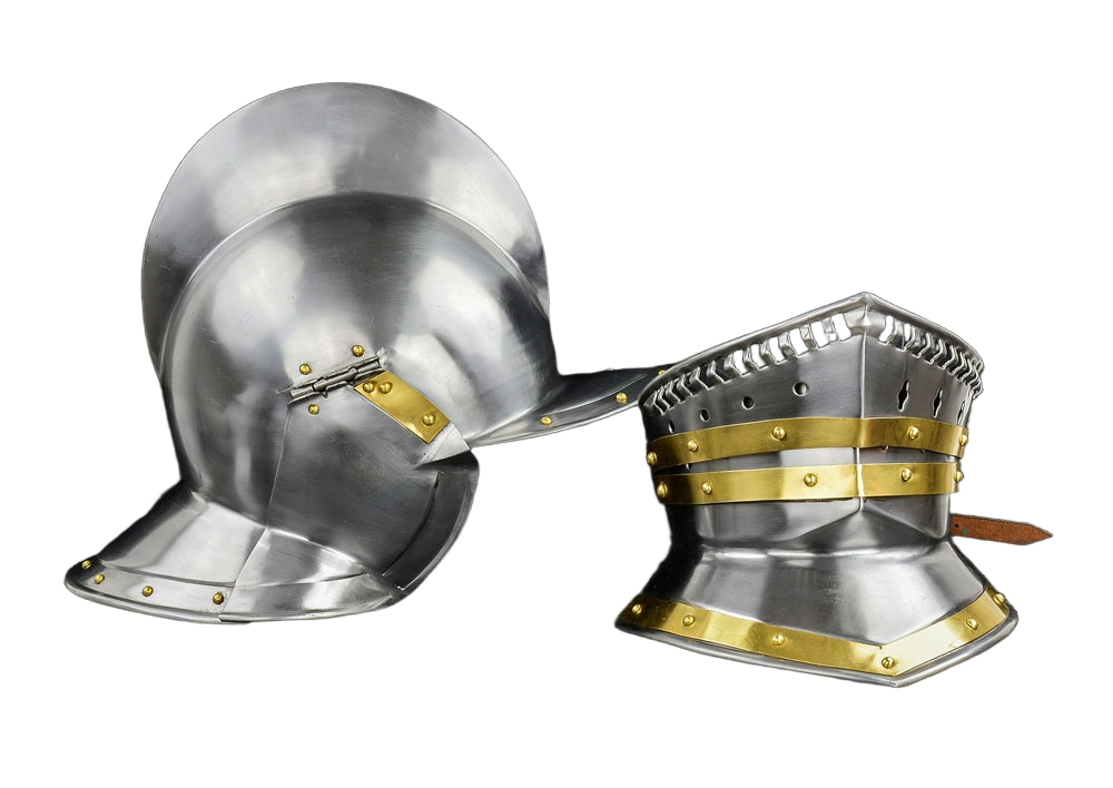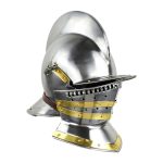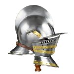 Prominent during the late 16th century renaissance, the Burogonet Helmet helped pave the way for the medieval sallet. Like the sallet, this light and easy to wear helmet is open faced and provides great protection. Made of high quality steel for reinforced protection, this piece features a detachable visor with a leather buckle and strap, polished brass ornamentation on the sides and on the falling buffe visor, as well as an attached collar and neck protector and a raised crest. This helmet is truly at the top of its class, in terms of strength and mobility, and is sure to bring out a powerful look for any renaissance knight. Great for display or collecting. The interior of these armor pieces are blackened.