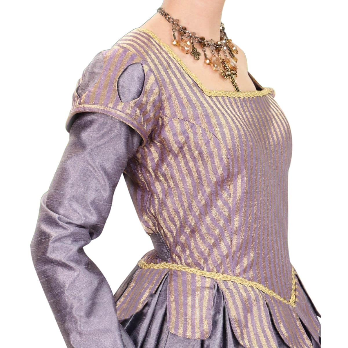 This elegant Tudor gown has all the splendor of just about any gown you could have found at the royal court of King Henry VIII. Made of a lush, lavender taffeta, this full-length dress features a full skirt and an attached top with golden stipes, shoulder caps with diamond-shaped period cuts and a scalloped waistline. A golden trim accentuates the dagged cuffs, waistline and the square neckline. A lace-up back with a generous modesty panel is in the back, along with an attached matching sash, which once tied in the back, will insure a true hourglass fit. This dress can also be worn with our small Period Bumroll #100974. Dry clean only.