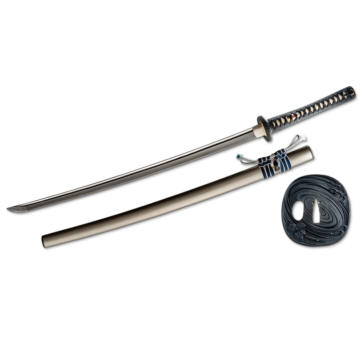 A beautiful 27 5/8 L6 blade featuring a straight hamon line symbolizing placidity. The kashira and tsuba juxtaposes the hamon with a depiction of turbulent sea with waves crashing against the rocks. The tsuka features black cotton sageo over white same with multi-finish planetary menuki. The saya sparkles with a beautiful silver flake with a gloss polish with a buffalo horn kojiri, kurikata and koiguchi adorned with a navy and white sageo.