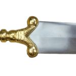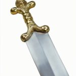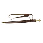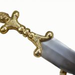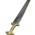 The Celtic Warrior Sword has a blade of EN45 high carbon steel and a cast brass hilt. It is paired with a scabbard of thick leather with brass fittings and an adjustable sword baldric with a brass buckle.