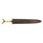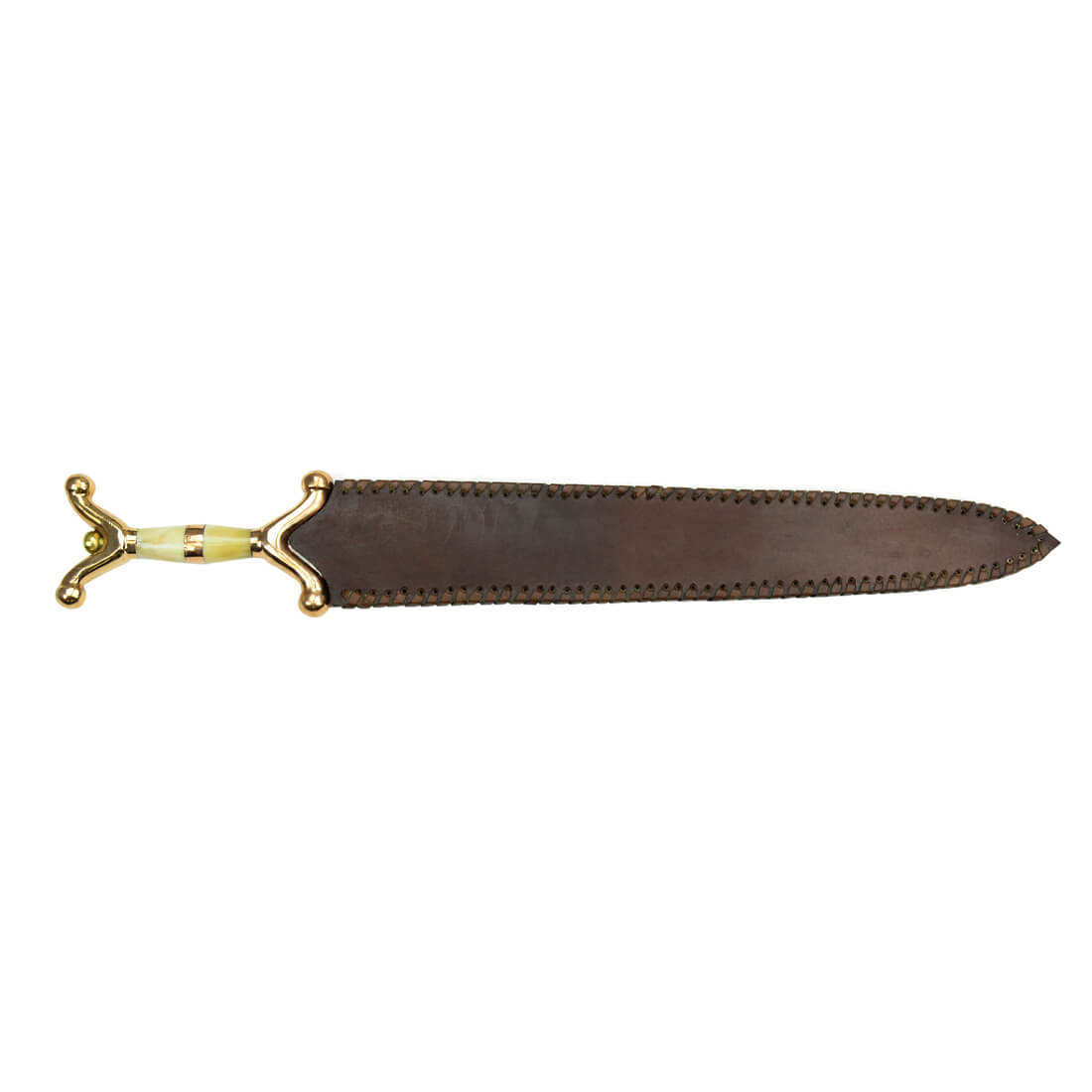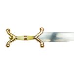 This Celtic Sword has a blade of unsharpened high carbon steel. The hilt is crafted from bronze and bone. The pommel nut is brass. The fitted sheath is crafted from leather.