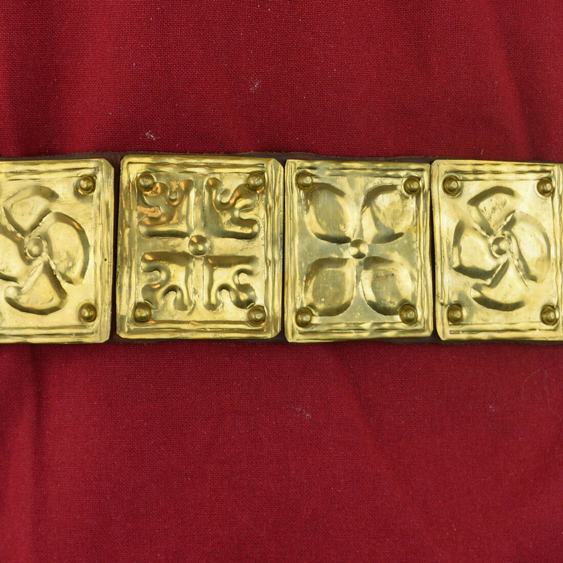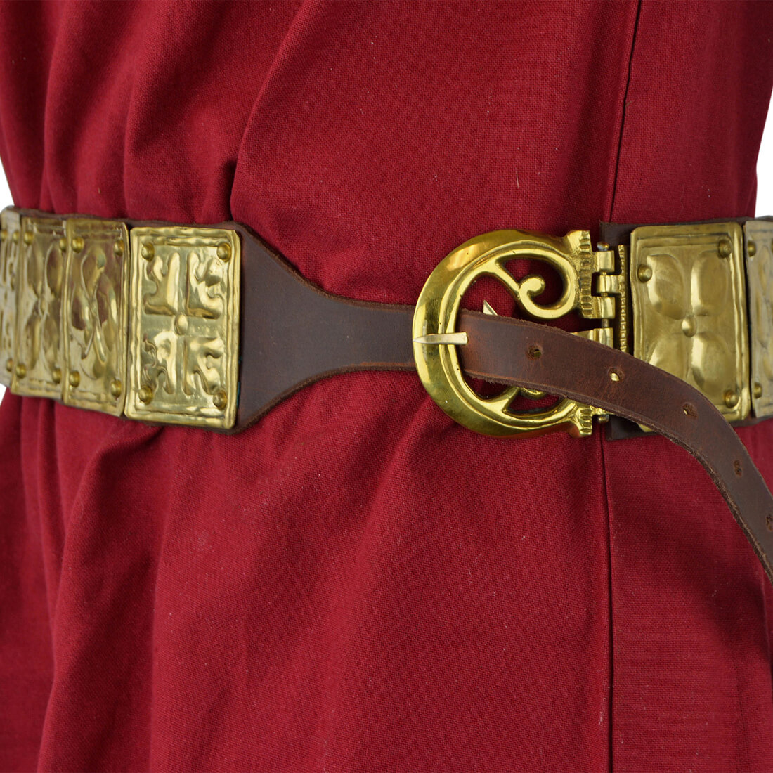 Inspired by the belt of first century Roman centurion, Facilis, wo was a part of the XX legion, this accessory is a standout. Crafted from brown leather, it wraps secure around the waist with a cast brass buckle closure. And to add style, solid brass plate ornamentation allign the belt’s length, complimenting the design nicely. This piece is the perfect finishing touch for an authentic Roman centurion look and is great for re-enactments.