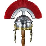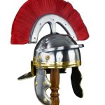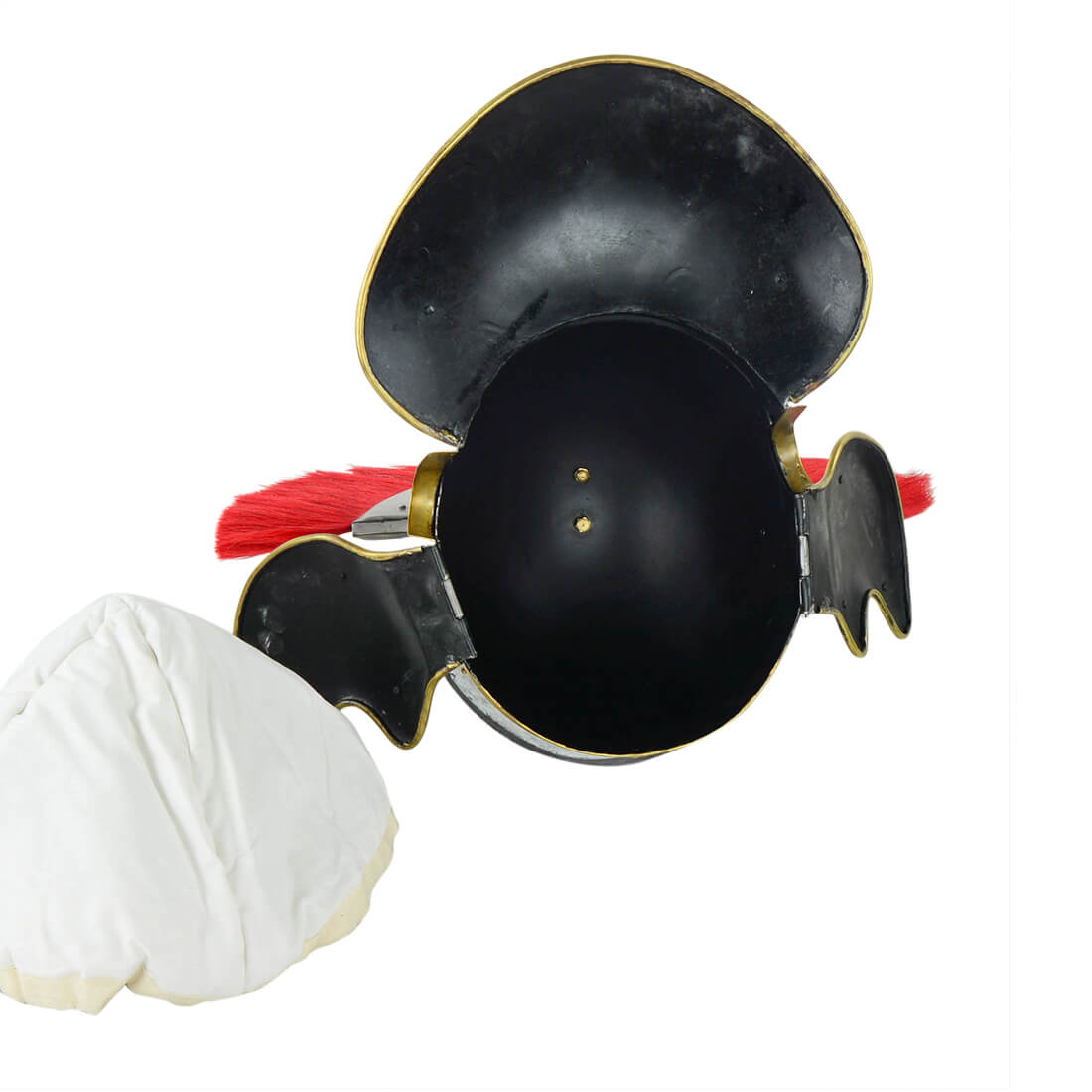 This Roman Imperial Italic Centurion Helm is constructed from 20 gauge steel with brass accents. Atop the helm is a steel crest with red horsehair. The separate crest is fitted atop the helm with a pair of brass nuts and screws. The interior of the helmet is blackened and unlined; included is a padded cotton arming cap.