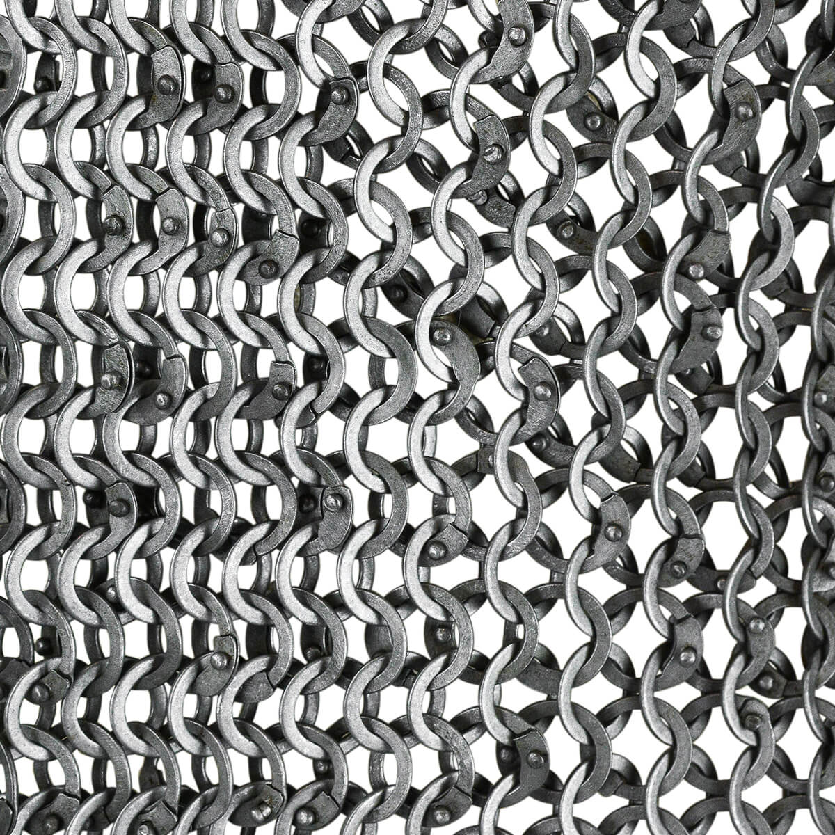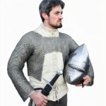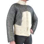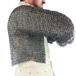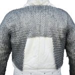 The half-hauberk is constructed from rings which are 17 gauge in thickness and with an internal diameter of 9 mm. Half the rings are dome-riveted for strength and these alternative with solid flat rings. This pattern of mail creation is a clever historical pattern which removes the need to painstakingly rivet every single ring individually.