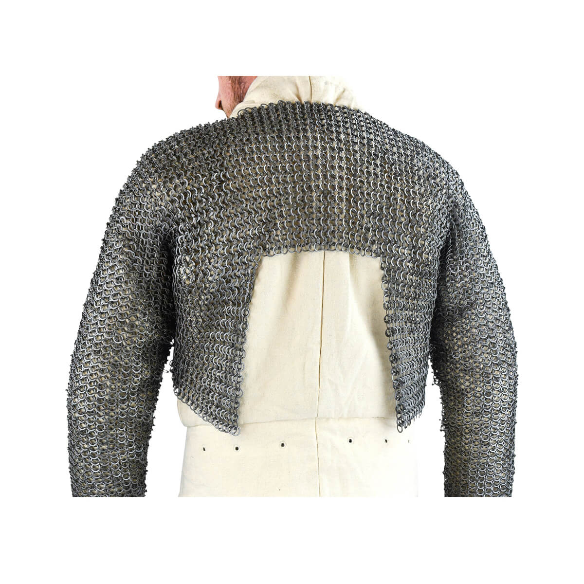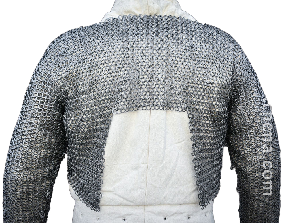This half-hauberk of chainmail is designed to fill in the gaps between plate armor by having an encompassing underlayer of mail over critical areas. The design puts mail where it needs to be and fills in defensive gaps in the armpits, arms, torso sides and collar. By omitting the lower half of the torso (which is already well-protected by a plate or brigandine cuirass) it greatly reduces the total weight of your armored defense. The torso of the armor has been designed to have a tapered form which follows the shape of the torso so that it lays flat against your padded armor instead of hanging straight down where it would be considerably less useful.