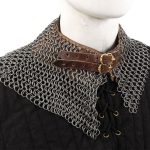 Give your shoulders and neck maximum protection with the Chainmail Standard. This type of collar was popular during the 14th to 16th centuries and because it resembled something worn by the Catholic clergy, it earned the nickname “Bishop’s Mantle”. Authentically designed after the chainmail armor style widespread in the Middle Ages which incorporated an interlocking metal ring pattern, this piece features high tensile wire round rings with butted construction and a natural finish. Each ring has a 16 gauge thickness and measures 9 mm in diameter. For extra comfort and protection, a leather collar serves as a base for the chainmail to be stitched upon. To ensure a perfect fit, adjustable brass buckles and leather straps are included. Great for costumes and re-enactments and a wonderful addition for any armor connosseur or medieval enthusiast. Construction: Butted