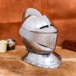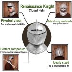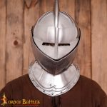 This Close Helm is crafted from 18 gauge steel and blackened on the inside. The two-part visor of the helm is hinged and can swivel upwards; additionally, the wearer has the option to raise only the top half of the visor, leaving the bottom half in place to protect the bottom half of the face. Being a close helm, the entire front half of the helm is hinged to allow to helm to be fitted around the head. The helm is secured closed with a hook.