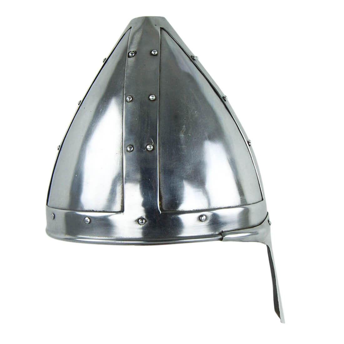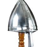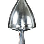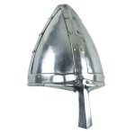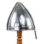This Conical Spangenhelm is made from 18 gauge steel plates with riveted and welded construction. The interior is blackened. The helmet comes with a padded cotton arming cap which can be inserted into the helm to function as padding.