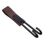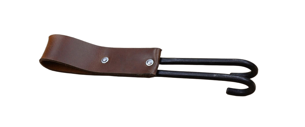 This Crossbow Belt Hook is constructed from blackened steel which is riveted to a leather belt loop. It can be used to make spanning a crossbow much easier by using the legs and body to pull back the bow for loading. Individual experimentation to account for different heights is needed to find the distance by which the belt hook must hang to most easily load the crossbow.