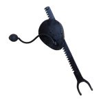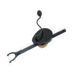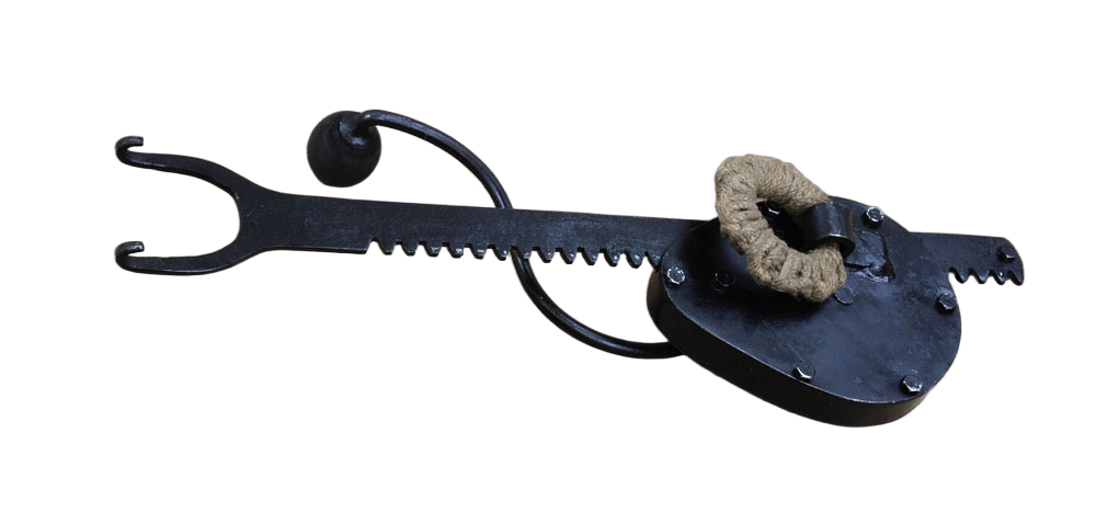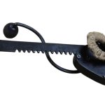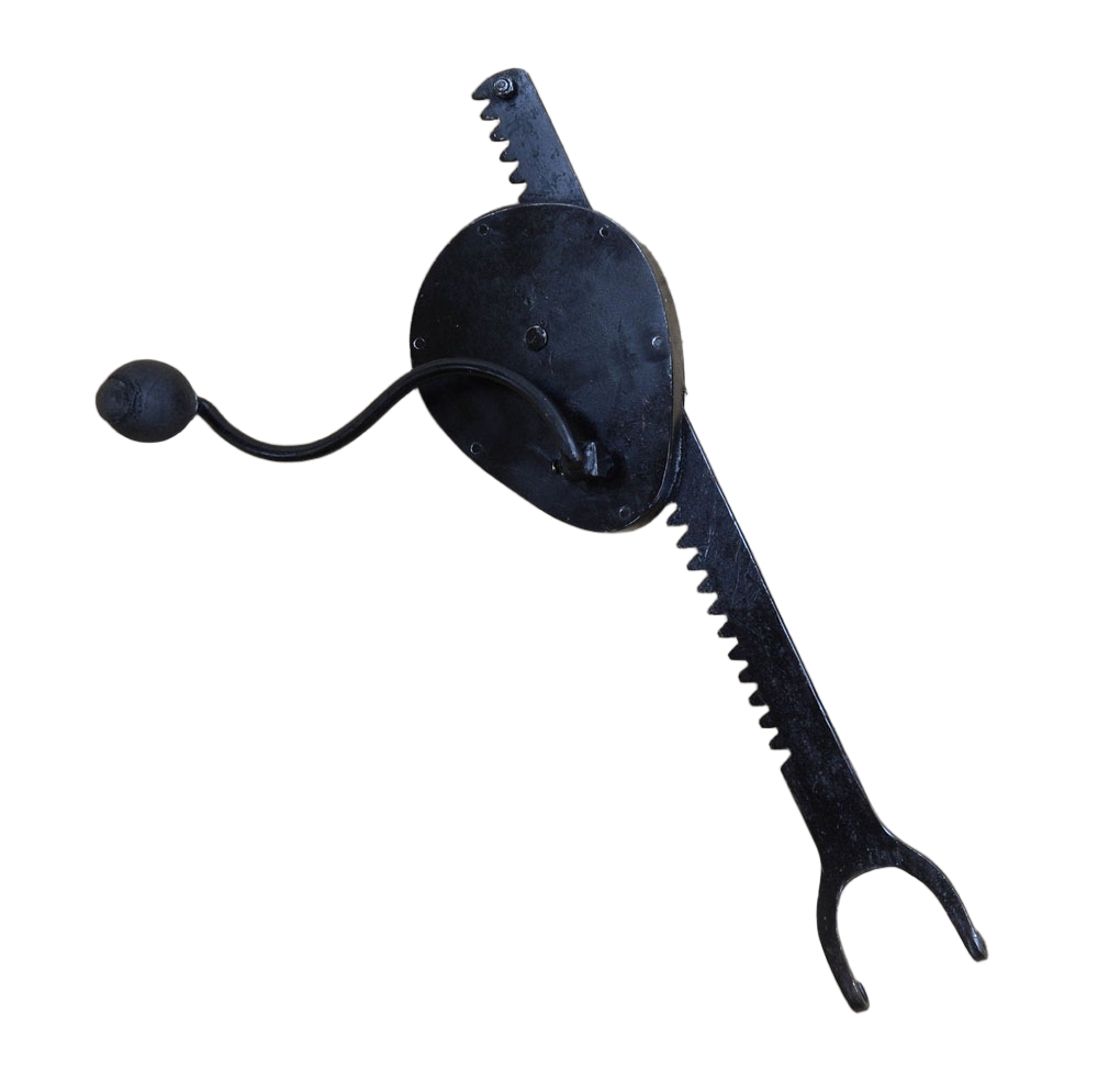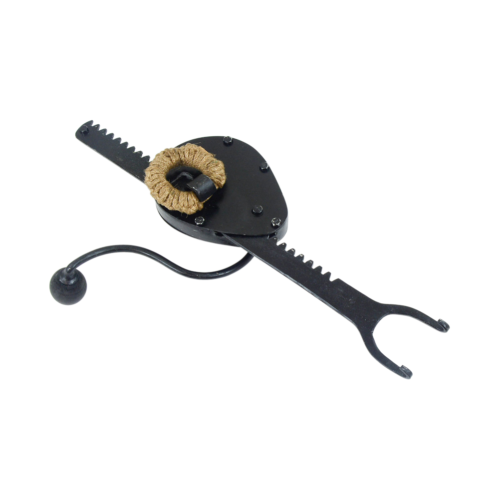This Crossbow Cranequin is crafted from blackened steel; the crank handle is steel with a wood grip. This mechanical spanning aid fits over the butt of a crossbow stock with its cord ring where it can then be used to span the bow prod. The crossbow stock needs to have pins or something to brace against to prevent the Cranequin from sliding down the stock when cranked.