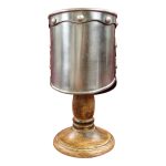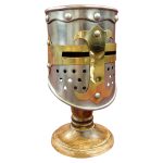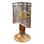 This miniaturized Great Helm is made of carbon steel, just like the full-scale originals and has a brass cruciform plate riveted to the face. The interior has been blackened. Perfect for adorning a desk with the visage of the Templars or armoring a knightly lawn gnome against rabbit raids. This helm comes with its own wooden display stand.