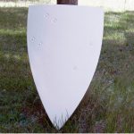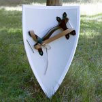 This solid shield is made of curved wood and covered in a white canvas with a red painted cross emblazoned on the front (color may vary). Leather arm and shoulder straps. No Express or Air Shipping Available. Measurements: Approximately 32″ x 20″