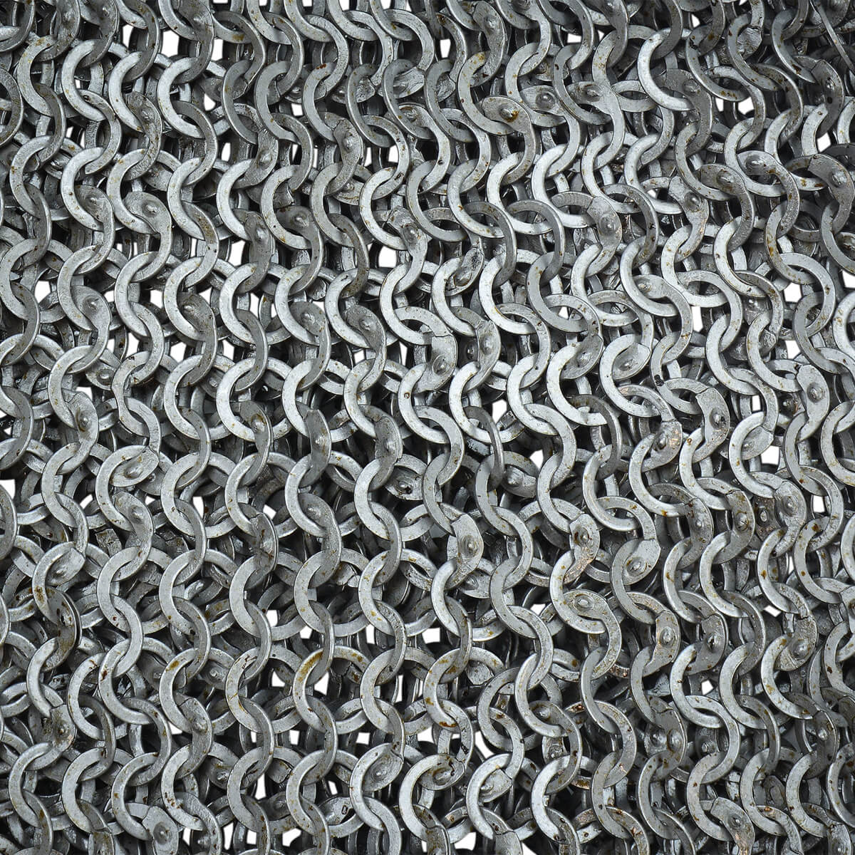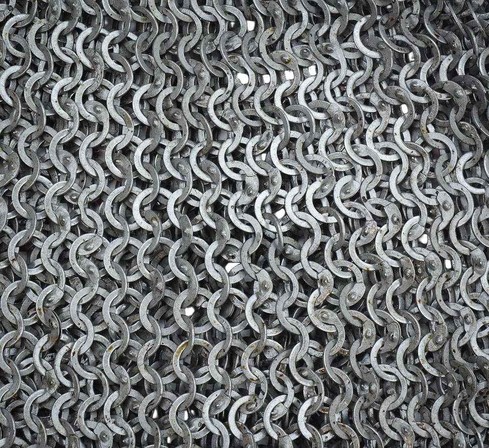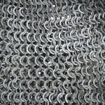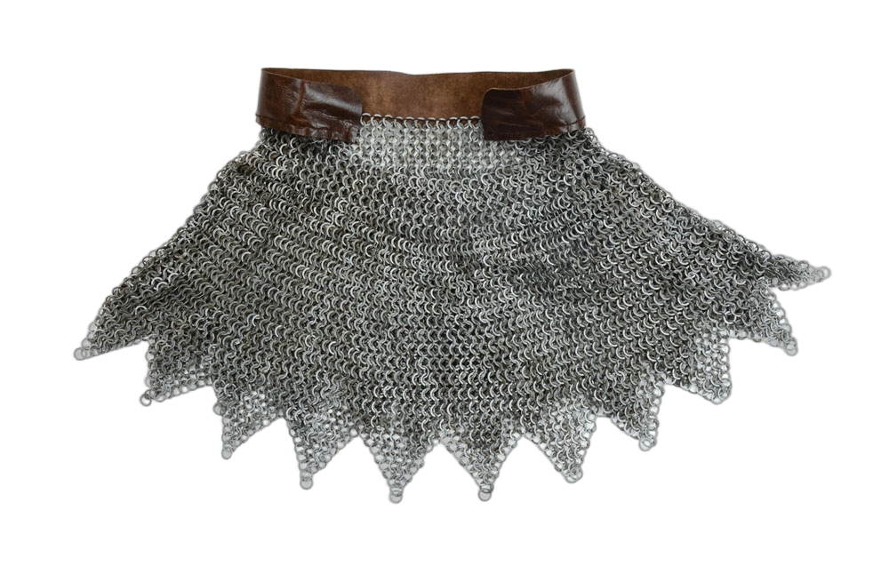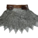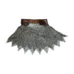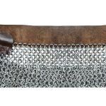 This dagged aventail is constructed from wedge riveted flat rings which alternate with solid flat rings. The chainmail is stitched to a leather band. It is ready to be riveted into a helmet to upgrade it with the further protection of a mail aventail. The individual rings are 17 gauge in thickness and 9 mm in diameter.
