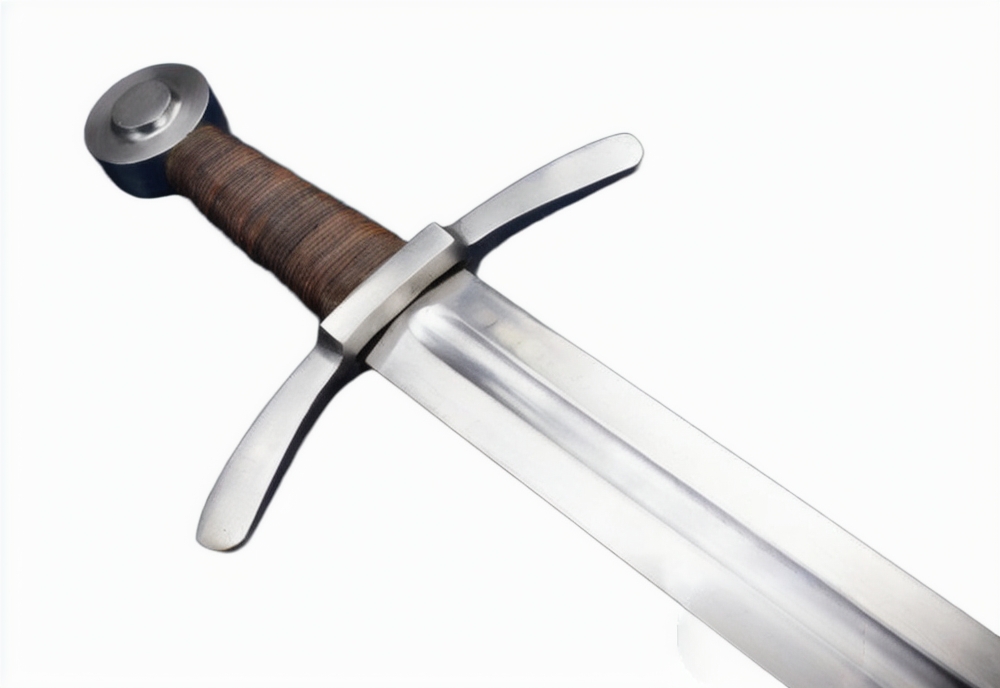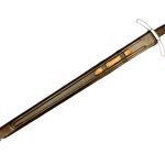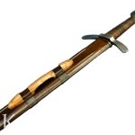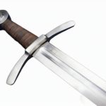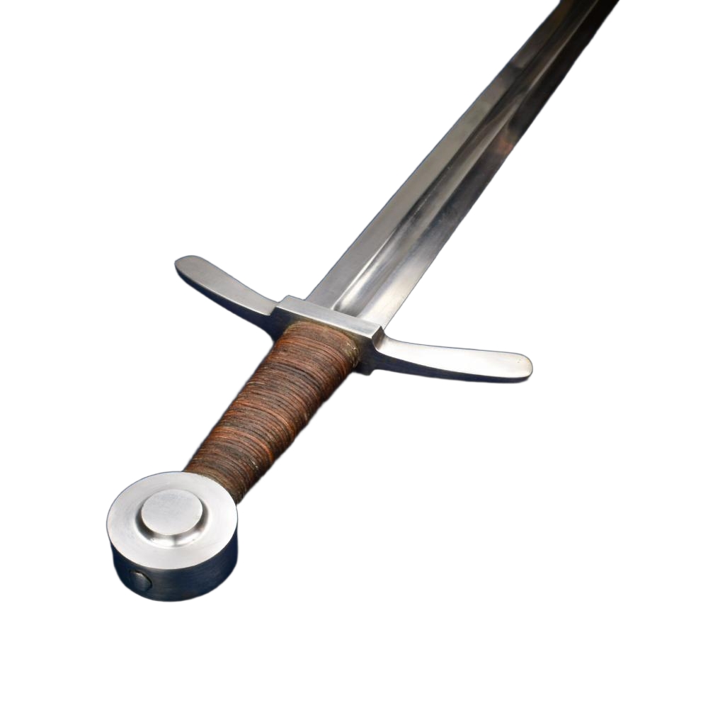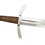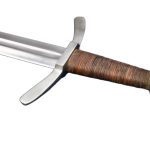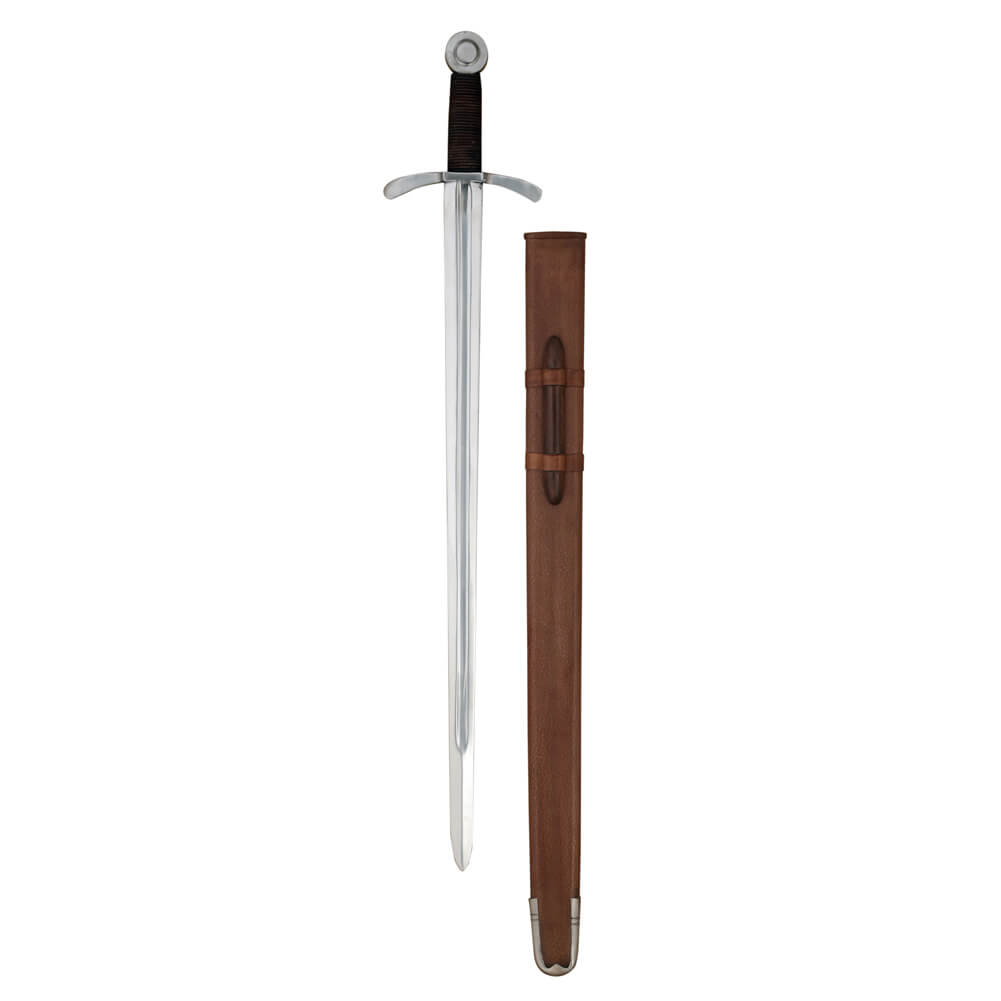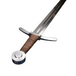 The Dark Ages Arming Sword is perfect as a fighting weapon or collector’s piece. Built for sport and stage combat, this Medieval arming sword has a thick and blunted blade of high carbon steel which is securely mounted and peened into a hilt of steel. The grip is wood which is wrapped in tight leather. Included is a wooden scabbard which is bound in leather and completed with an integrated wooden suspension loop for wear.