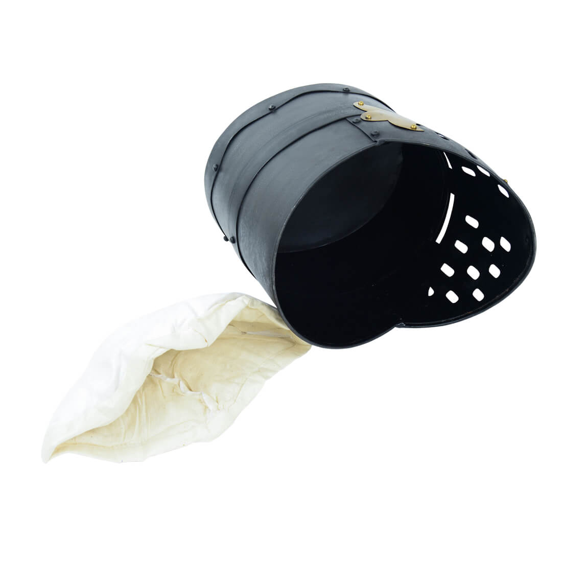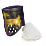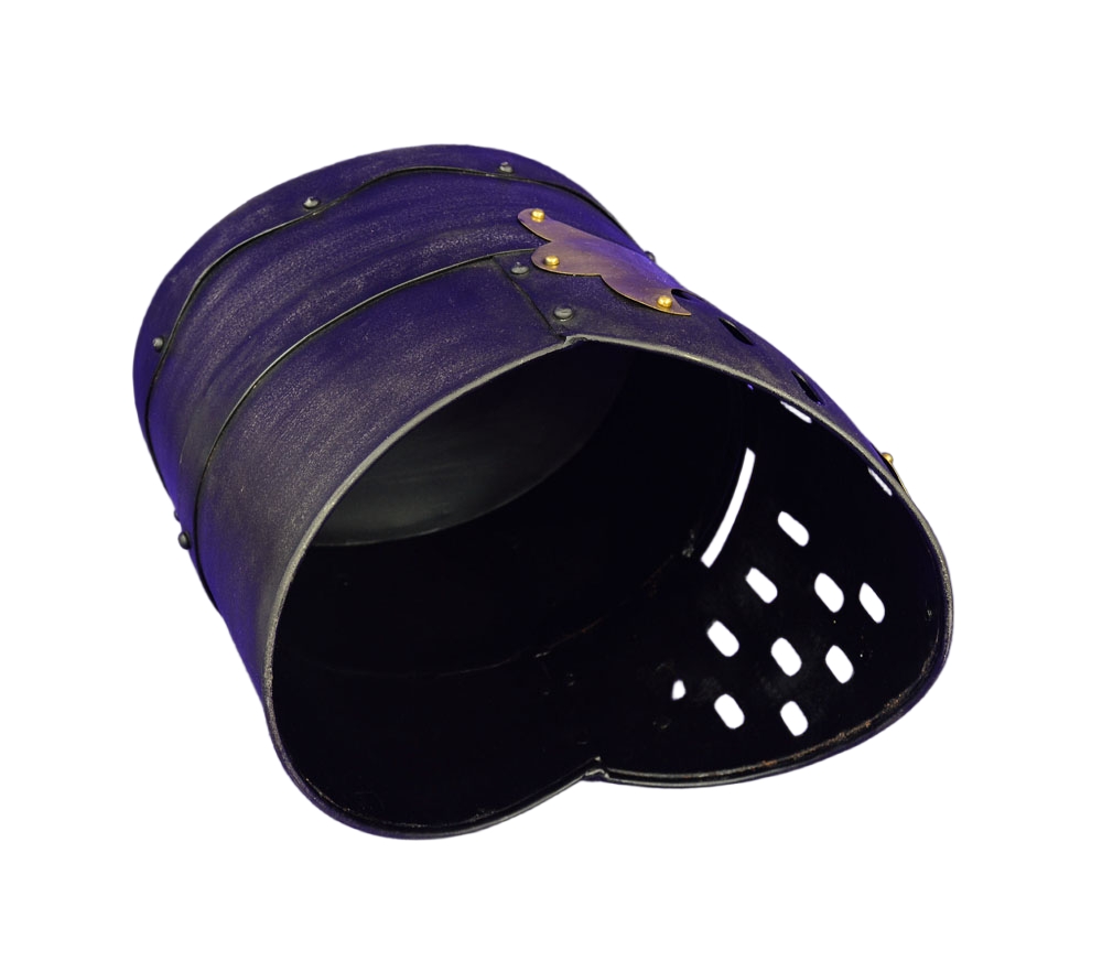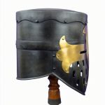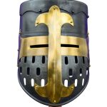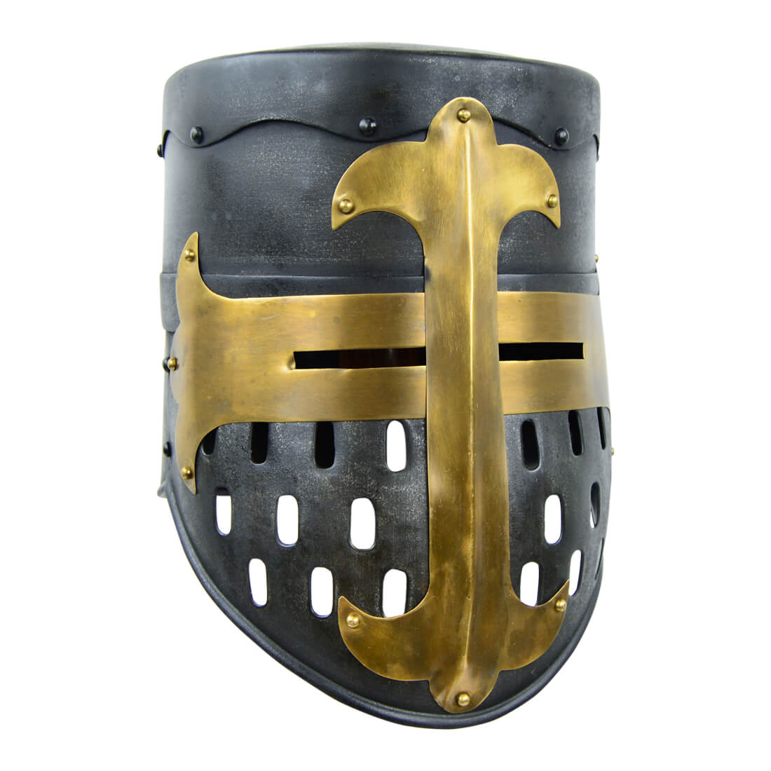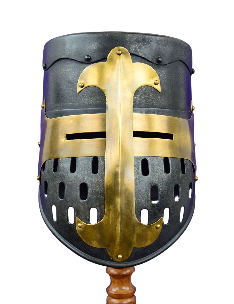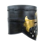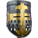 This Dark Knight Norman helmet is a one of a kind authentic reproduction by Deepeeka. It was developed early in the 13th century, and was a form of French Great Helm depicted in the Maciejowsky Bible. This impressive helm is made out of quality 18 gauge steel and features real brass plating. This piece makes for a great collector’s item and is fully wearable for reenactments and high end costumes. The interior is unlined. A simple cotton arming cap is included.