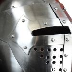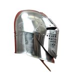 The 14th Century Bascinet helm is crafted from 14 gauge steel. It is fitted with a hinged visor which can be held in the up position with a spring-peg. The interior of the helm is blackened and fitted with an adjustable leather suspension liner. The helm is fitted with an adjustable leather chin strap with a brass buckle.
