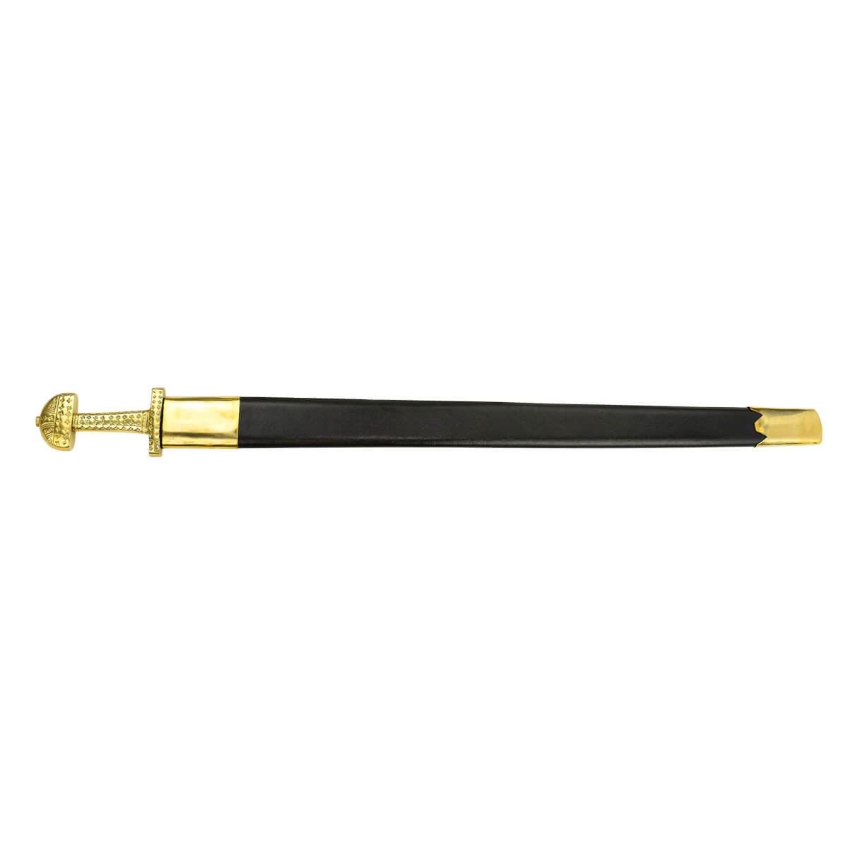 This early Viking sword has a blade of tempered EN45 high carbon steel which is durably mounted into a hilt of solid cast brass. The guard has a tab of black felt which cushions the guard and protects it from scratches when in contact with the scabbard. This felt tab can be removed if desired. The scabbard is wood wrapped over with stitched leather and finished with brass fittings.