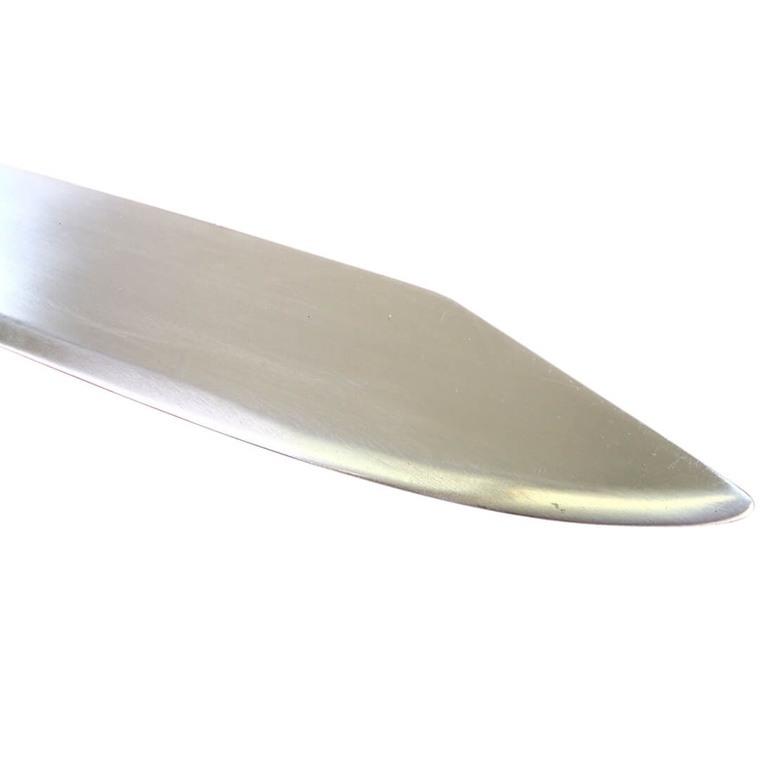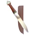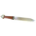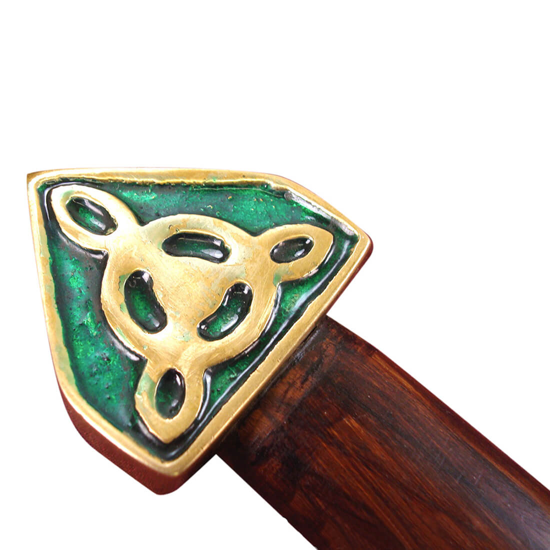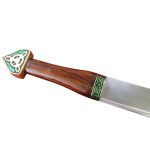 This Viking Seax has a blade of high carbon steel. The grip is of stained wood and the top grip ferrule and pommel are of brass, filled with decorative green enamel. Comes with a stitched leather sheath.