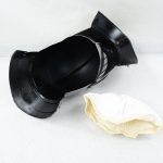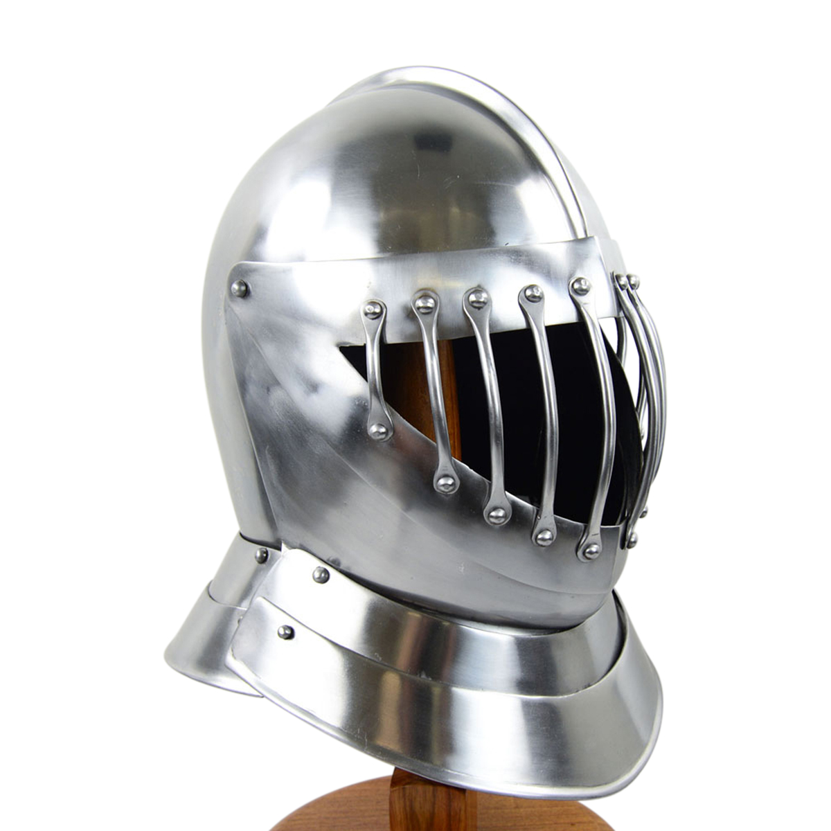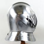 This Close Helm is constructed from high carbon steel and is well-articulated. The double-visor helm opens vertically on its swivel-rivets to allow the head to fitted within. The grill visor can be easily raised and lowered. The plates protecting the base of the neck are also articulated on swivel-rivets so as to not obstruct the movement of the head and neck. The interior of the helm is blackened and un-lined. A simple arming cap of cotton is included.