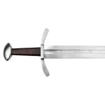 Intended for stage and sport combat, this version of the Sword of St. Maurice has a thick blade with thick edges and a large tang solidly peened to the pommel. The blade is EN45 high carbon steel. The hilt is mild steel with a leather-wrapped wooden grip. The scabbard is leather-over-wood and finished with a steel tip and a wooden suspension loop.