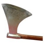 This Viking Axe by Deepeeka features etched designs on both sides reminiscent of these finds. The axe head is made crafted of thick high carbon steel and is riveted to a thick, stained wooden haft. This is a big axe with a burly, blunted steel head and thick haft. The axe head is 11 mm thick close to the haft and tapers to 6mm closer to the edge.