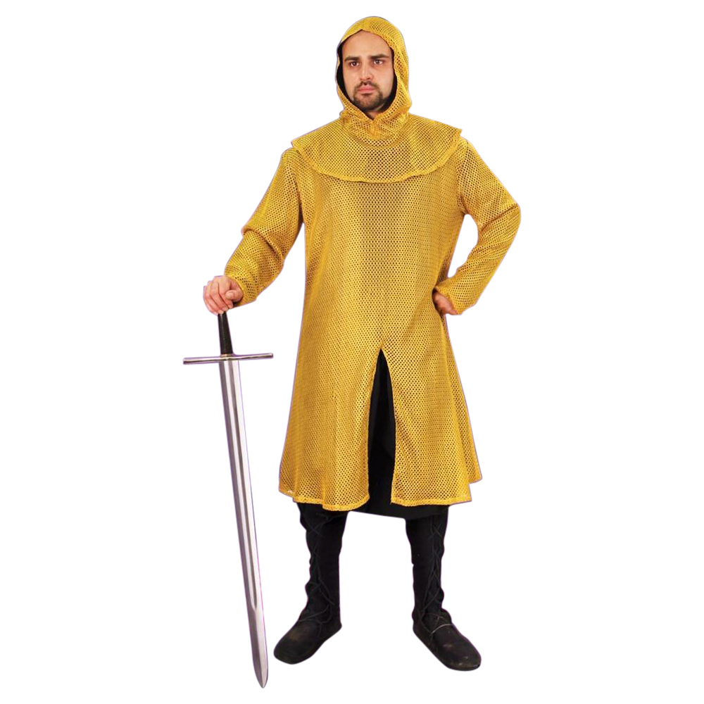 This faux mail tunic and coif is ideal for theatrical productions where real mail is too cumbersome. It is made of a poly cotton material which at a glance looks just like real mail. Includes mail shirt, coif and mantle. It also makes for an excellent entry-level piece of garb for the budget conscious!