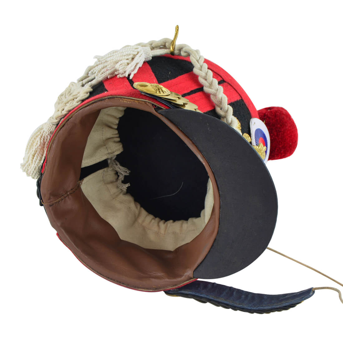 This Napoleonic French Shako is constructed from thick leather; it is overlaid in black felt on the sides and decorated with red cloth banding and brass accents. The leather chin straps with brass plates are fastened with a leather cord. The removable braid hangs from the two brass hooks atop the helm and the plume is fitted behind the cockade with a separate brass holder.