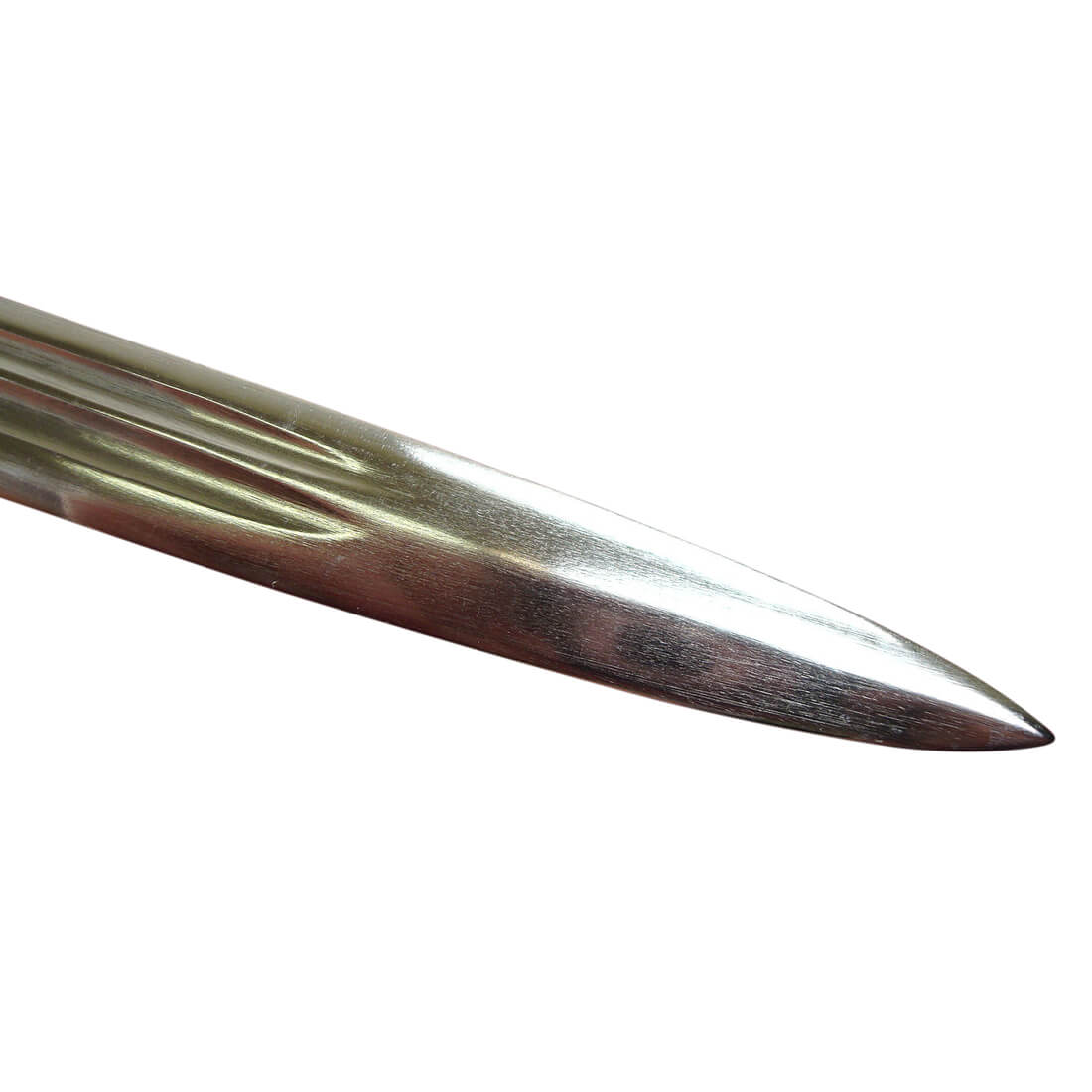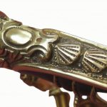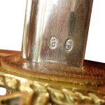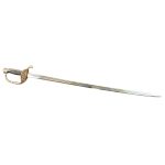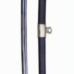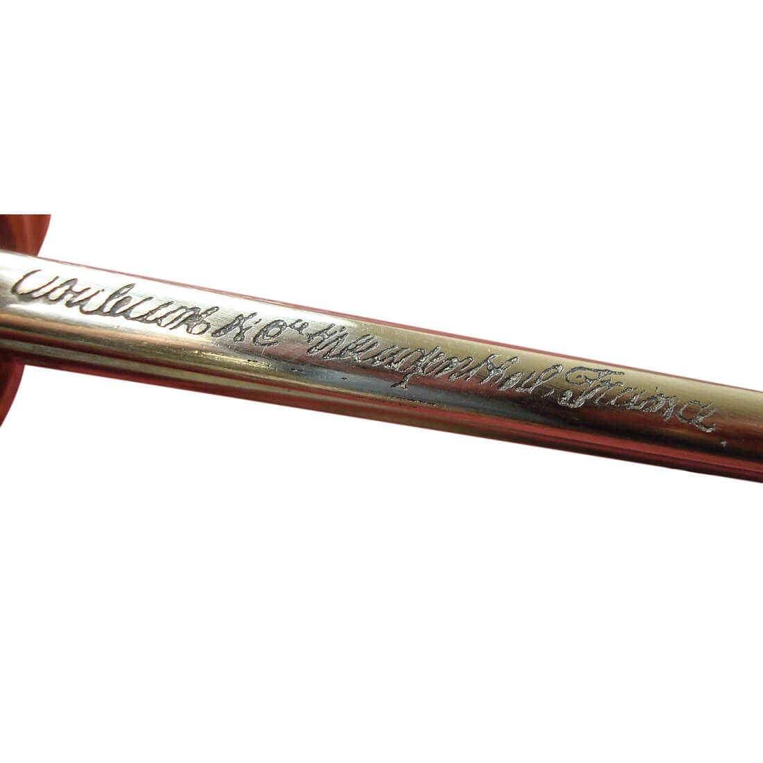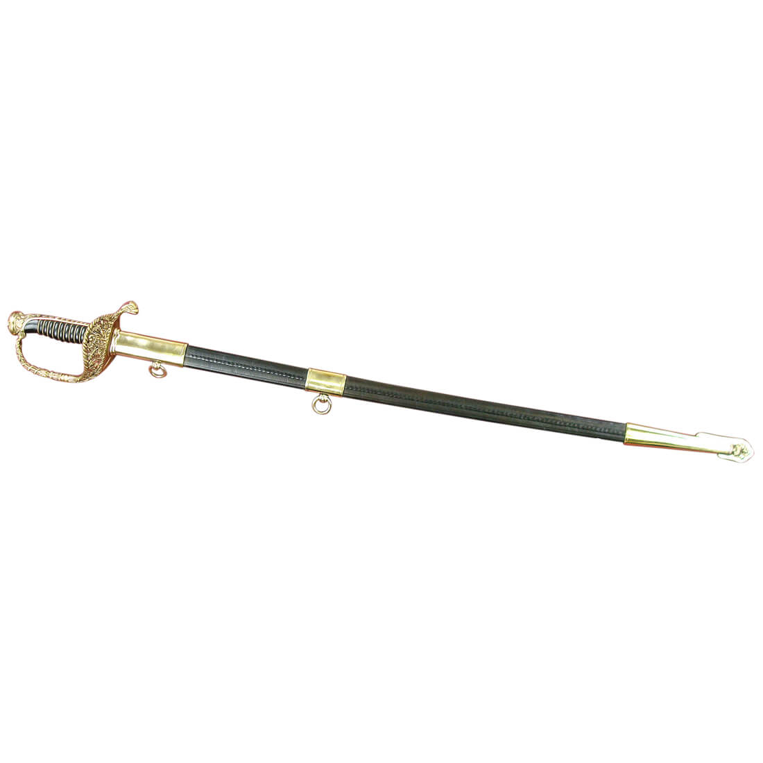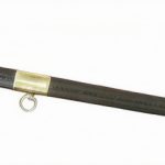 This French Naval Officers Dress Sword is a reproduction of the Model 1854 pattern. It has an unsharpened blade of tempered, high carbon steel. The spine of the blade bears the signature of Klingenthal – the famed, state-run sword manufactory in eastern France. The brass hilt is cast with an anchor and seashells. The molded black grip is wrapped with inlaid brass wire. It comes with a leather scabbard with brass accents and two suspension rings. A leather washer at the base of the blade protects the crossguard from colliding into the brass throat of the scabbard.