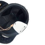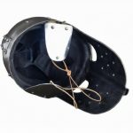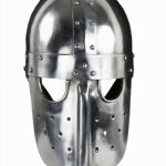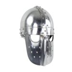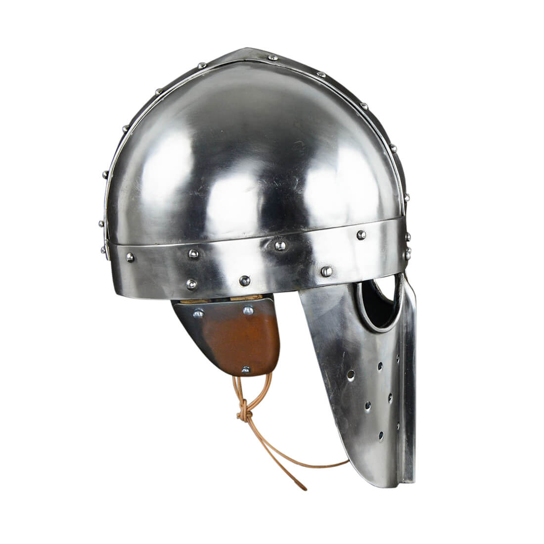 The Furdess Helm is constructed from riveted plates of thick, 14 gauge steel. The interior of the helm and the inside of the faceplate and hinged side plates are lined with leather. The internal leather suspension liner can be adjusted to fit and bands of foam padding are hidden behind the leather at the base of the helmet dome. Two brass rings on the side plates are used to tie a chin strap in place – a leather cord is included to be used for this purpose.