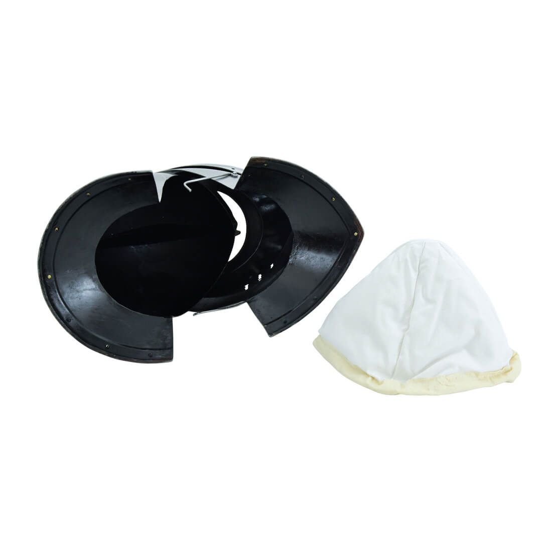 The interior of the helmet is unlined and blackened. A separate padded cotton arming cap is included.