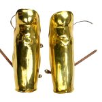 These high quality Greek Brass Greaves are a perfect addition to any of our Greek Breastplates and Cuirasses. It is made out of steel and plated in real brass, leather lined, and has leather straps to adjust the fit. The brass itself is slightly pliable and can be pushed or pulled apart to better mold its fit around a leg. These are perfect for costumes and collection alike.