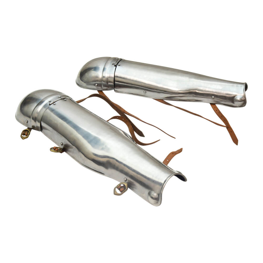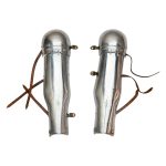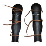 This pair of hinged greaves with hinged knee armor is constructed from 18 gauge steel. The armor buckled onto the legs with a set of leather straps and brass buckles. The knee plates are well-articulated and give a good range on unhindered movement.