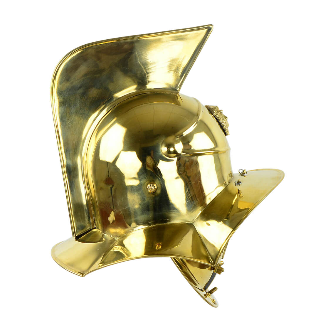 Gladiators who fought in the arena were a special breed of fighters. Tough, deadly, and doomed to death, they were the spectacle and entertainment of the Roman Empire. Their helmets were just as unique as their purpose. This replica has been meticulously hand-crafted to ensure historic authenticity. Our replica is superb and can be used for reenactments or be put on display. This Gladiator Helmet is constructed from 18 gauge brass; the interior of the helmet is blackened and unlined. The faceplate and throat guard are separate components and one or both can be removed if desired.