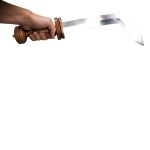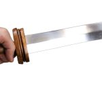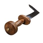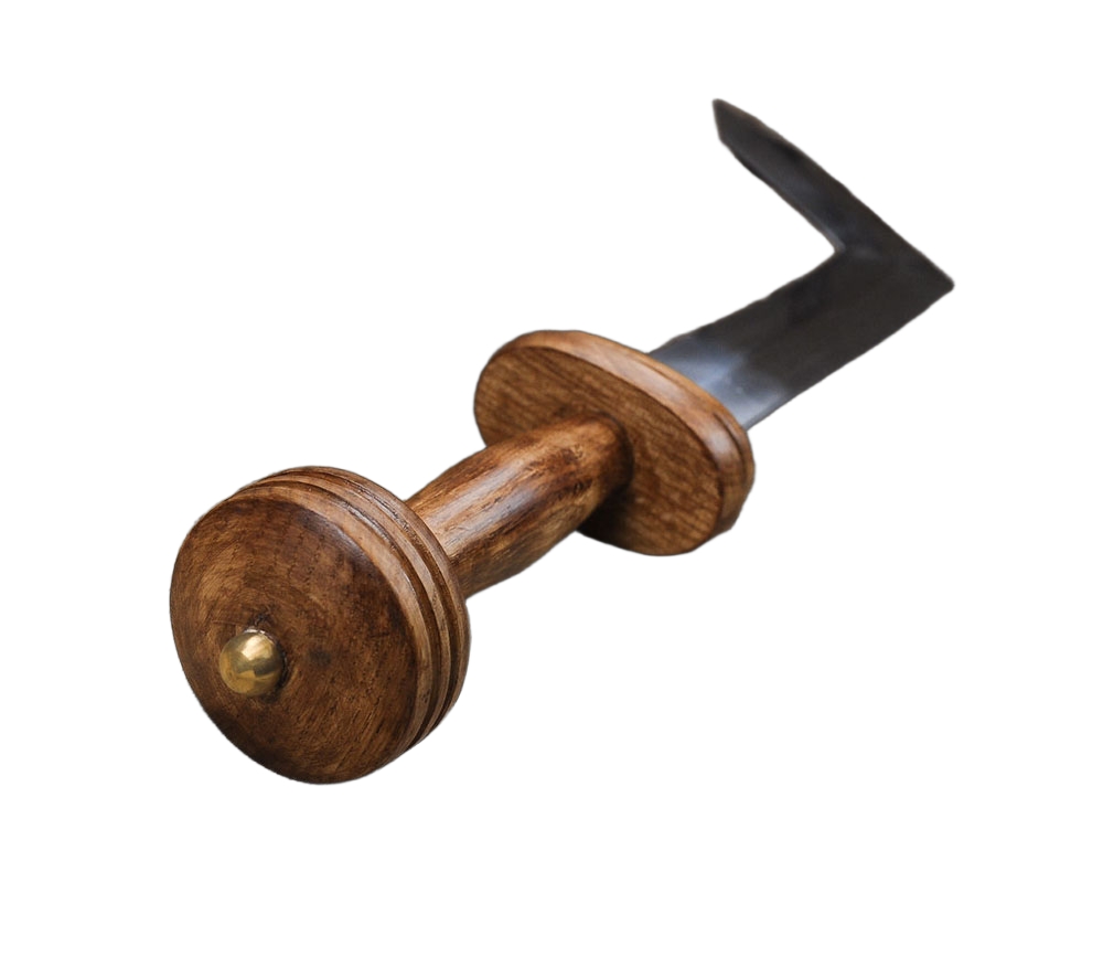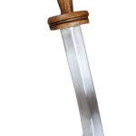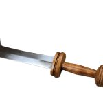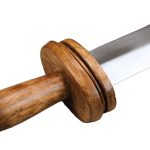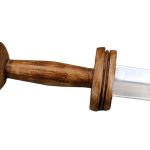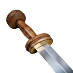 This Sica Sword has a blade of high carbon steel and a hilt of carved wood. A protective brass plate is fitted to the base of the guard.