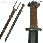 As a tribute to the notable 8th century Viking leader comes the Godfred Sword. Showcasing a beautifully patterned and folded steel blade, this piece features an eloquent Damascus guard and pommel and an interwoven leather grip with a deeply fuller distal taper providing excellent balance. This sword fits nicely into the leather covered wood scabbard, complimented by belt hooks and bronze accents. Whether for collection or display, this is one weapon that will leave a lasting impression.