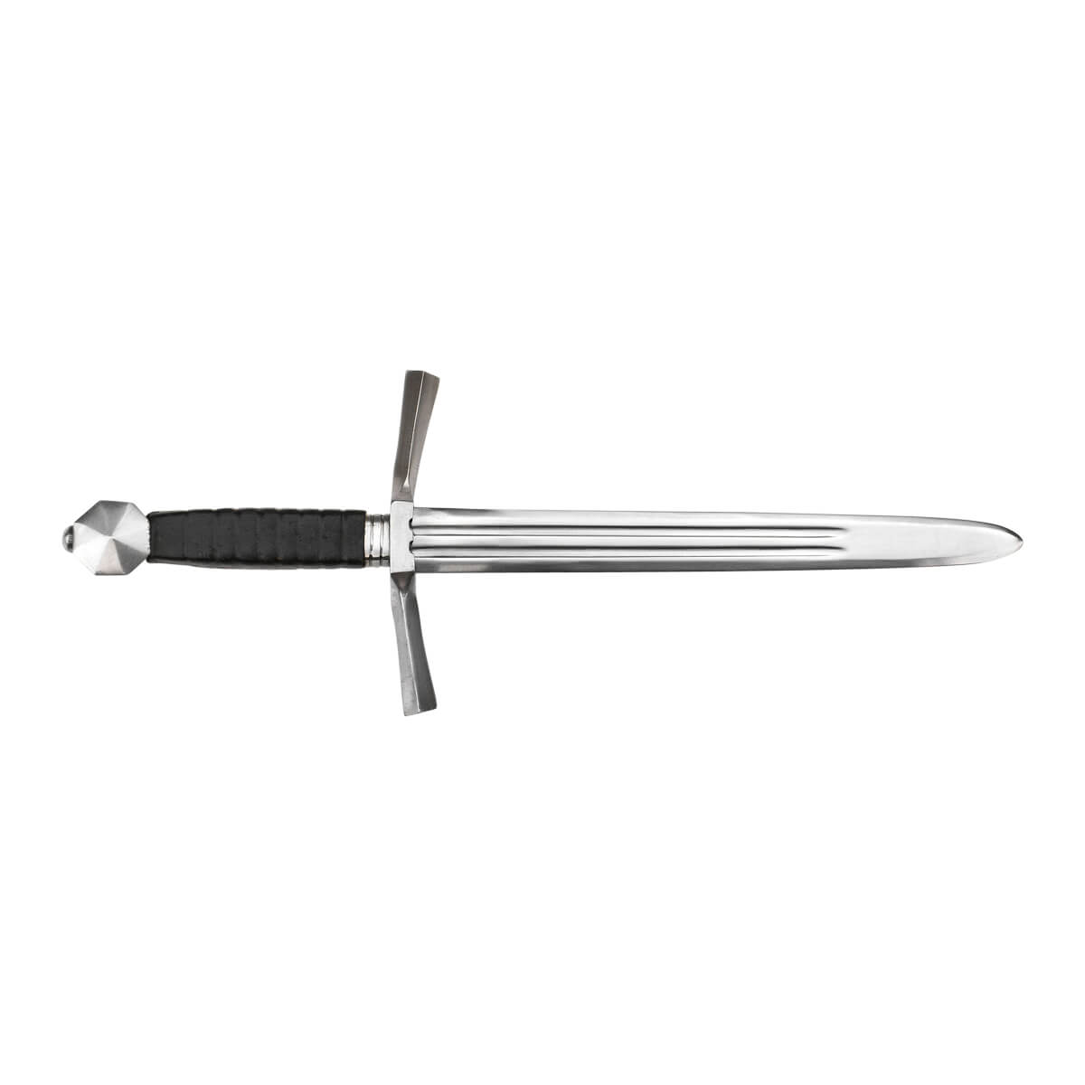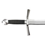 This large Medieval war dagger has a blade of high carbon steel; the hilt is made from steel and the wooden grip is bound in black leather. Included is a durable scabbard of thick leather with stitched construction.