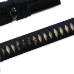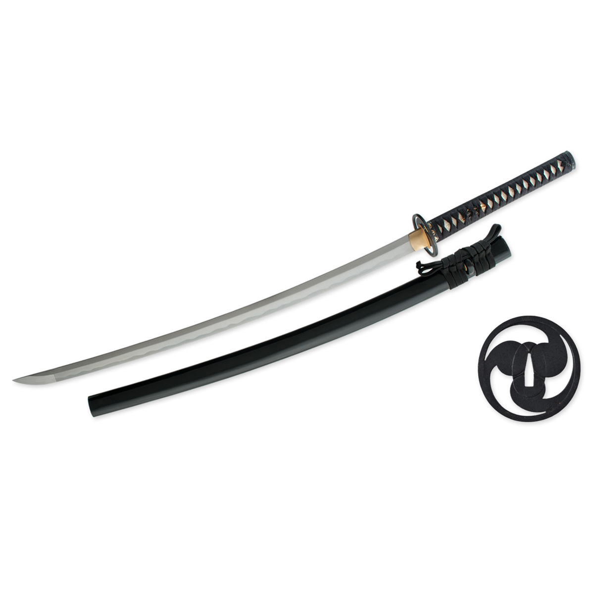 The Great Wave Katana made by Paul Chen for Hanwei displays the Tomoe motif used frequenly for family crests and shrine decoration. The koshirae are crafted in blackened iron and feature the Tomoe mon. The bladeon the Great Wave Katana is hand-forged from T10 high-carbon steel featuring a long (o)kissaki and is differentially hardened to produce a distinctive hamon. The saya is deeply lacquered in black. The rayskin of the tsuka has a premium woven Japanese black cotton wrap with a matching sageo.See models SH5002 and SH5022 for the Great Wave Wakizashi and Tanto.