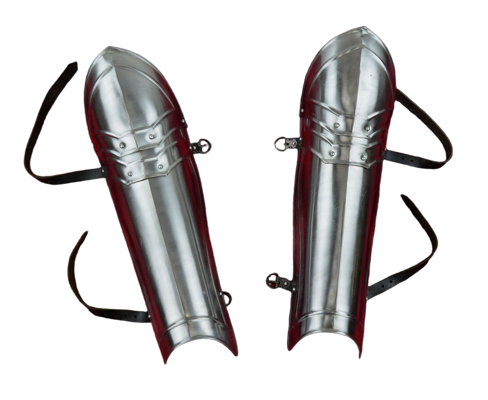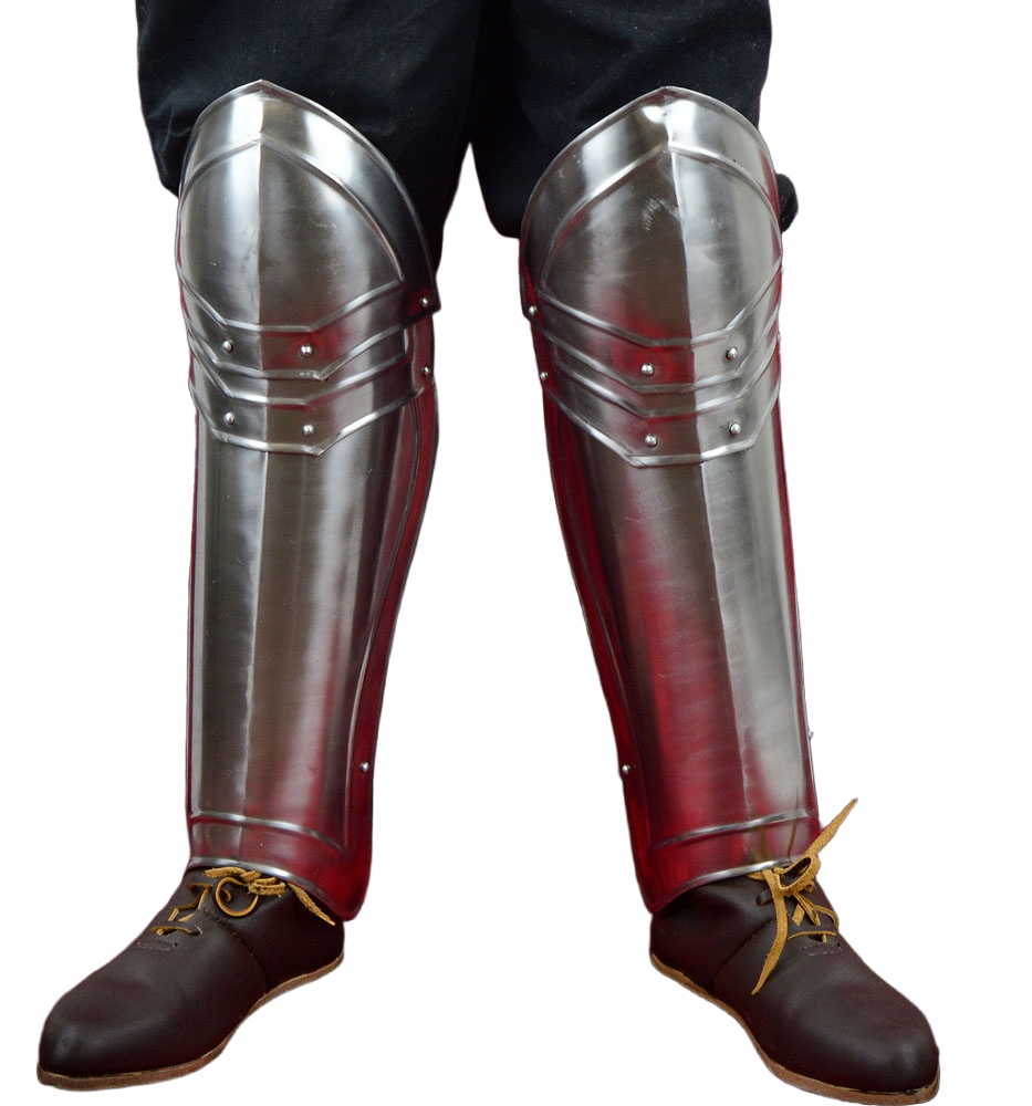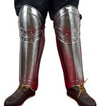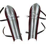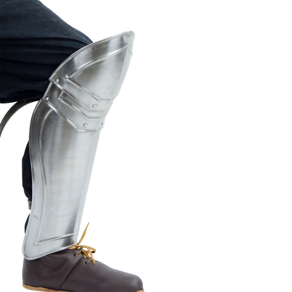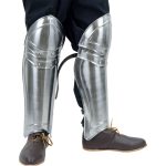 When engaging in battle, it is important to ensure you have proper leg protection and this is where the Greaves with Fixed Poleyns promise to be effective. Modeled after the protective armor that has been around since the days of ancient Greece, this set is constructed from 18 gauge steel and is comprised of three separate plates riveted together to make a single, solid piecewith a blackened interior. A comfortable and secure fit is ensured with the inclusion of adjustable leather straps and antiqued steel buckles. With authentc design, these greaves are perfect for costumes and re-enactments. Overall Length: 23”