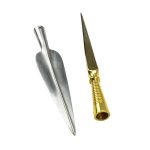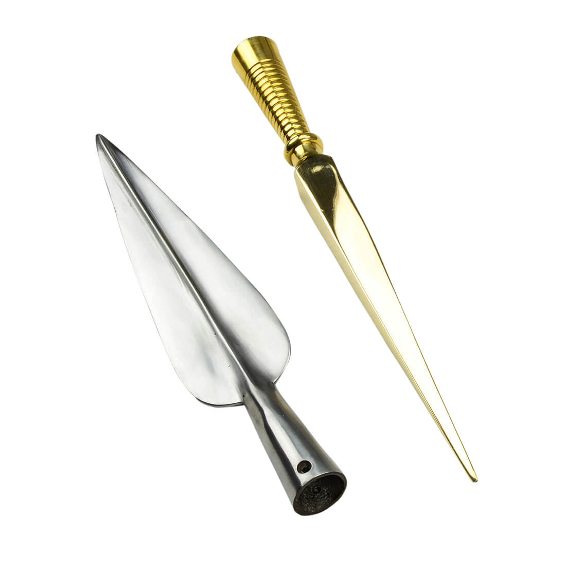 This Greek Spear set consists of a steel spearhead with is paired with a weighted cast brass end cap. They are ready to be mounted to your own spear haft. Pre-drilled holes allow for them to be secured to the tapered end of your spear. Mounting hardware not included. Socket Diameter for both spear and end cap is approximately 7/8”
