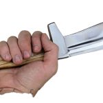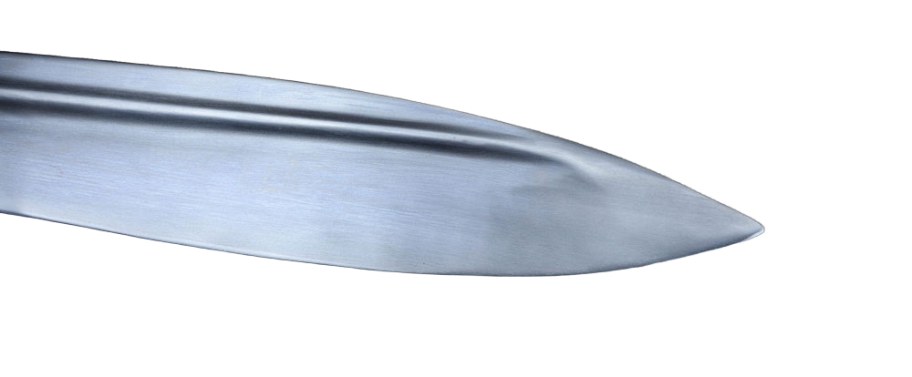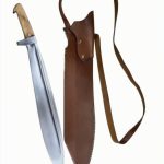 This Greek Kopis has a blade crafted from high carbon steel; the thin blade profile matched with a central spine for rigidity ensures that this Kopis is a quick and fast striking blade and not a ponderous performer. The guard is steel and the grip is finished with two halves of wood solidly riveted with the steel tang.