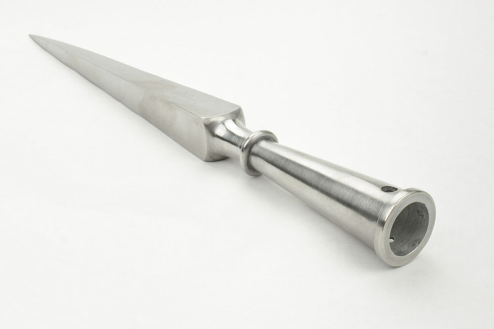 This Greek Sauroter Butt Cap is crafted from steel. A pair of pre-drilled holes allow you to secure it to your own wooden pole. Mounting hardware is not included.