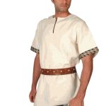 This short cut tunic is perfect for either the market streets or under any Greek armor. The sleeves and bottom are accented with a Greek trim which emulates the waves of the Aegean. 100% cotton.